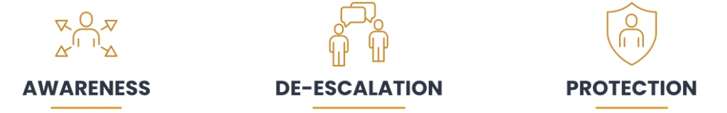 - De-escalation looks at techniques to de-escalate situations, how to use your voice and tone, mental health as a factor, and how to remove yourself safely.